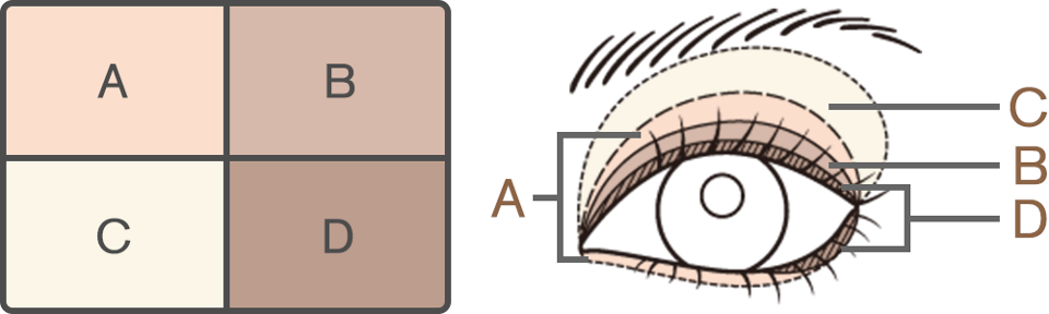 - 5. 下まぶたの目頭から目尻に向かってAのニュアンスカラーを入れ、目尻から1/3くらいにDのシェードカラーを入れます。