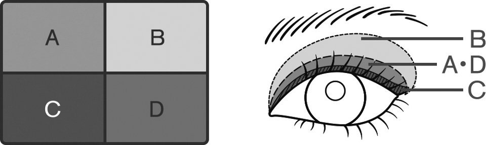 - 2. AのライトメインカラーとDのミディアムメインカラーをミックスしてお好みのカラーに調整し、アイホールにブラシでぼかします。