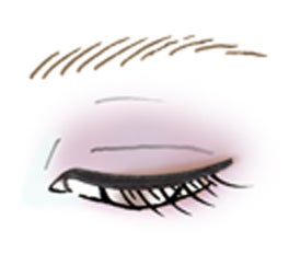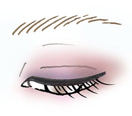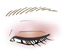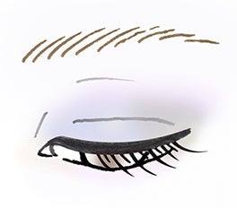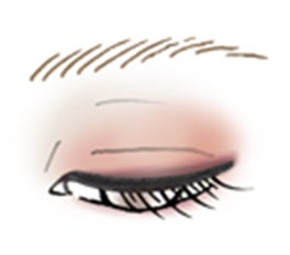 - 使用细头,将D以空开中央的方式描画于眼睛边缘处,并在眼尾侧三分之一处朝着眼窝方向刷开。同时描画于下眼睑(眼尾侧三分之一处)。