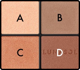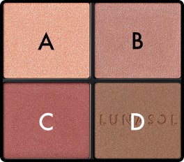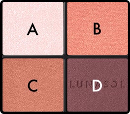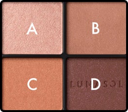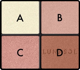 - 使用粗头,将B涂于眼窝处(略窄于眼窝)。接着将B叠加于眼尾侧的眼睛边缘,形成光泽的渐变。