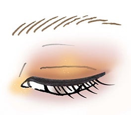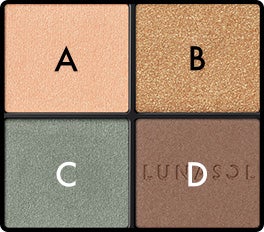 - 使用刷头,将D在上眼睑的B和肌肤的交界处晕开,并晕开至眼尾侧。同时,将D涂于下眼睑处。