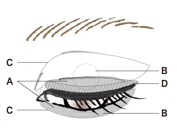 - Bを上まぶたの中央と下まぶたの中央に太チップで入れます。