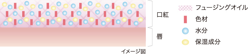 口紅の色材と水分を抱えこみ密着するネット構造を形成。