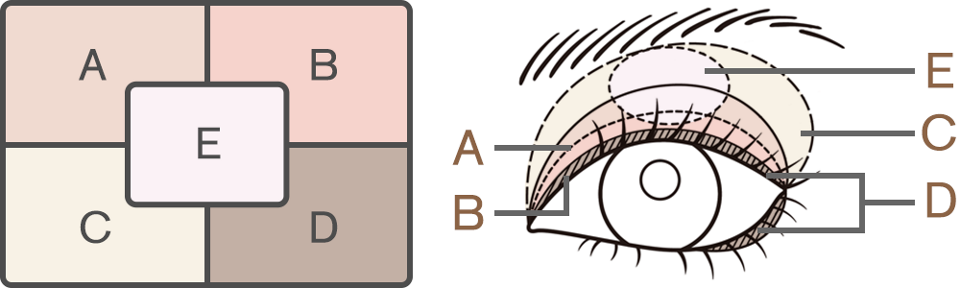 - 5. Cのハイライトカラーを下まぶたの目頭から2/3くらいに入れ、目尻から1/3くらいにDのシェードカラーを入れます。